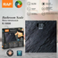 The RAF Bathroom Scale combines precision and style for your daily weighing needs. Its 6-mm tempered glass platform can support up to 360 kg, ensuring durability and safety. The anti-slip pads and supporting frame provide stability, while the large display with automatic on/off and battery indicators makes it convenient to use. Switch easily between kg and lb units for personalized measurement.